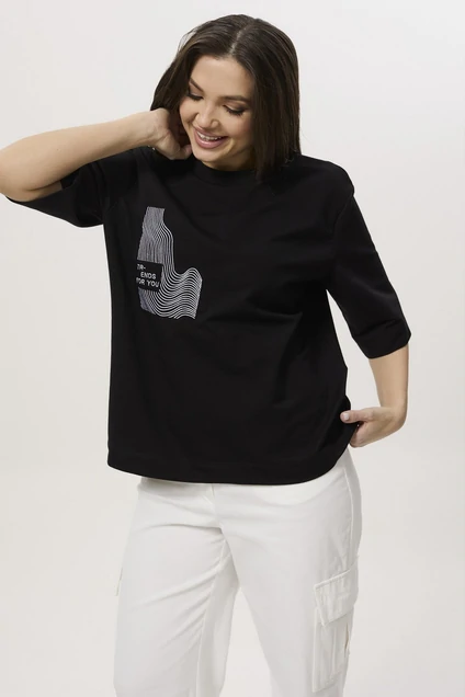 Перед цельный с дизайнерской вышивкой "волна". Горловина округлая, обработана бейкой. Рукав длиной по локоть, одношовный, линия плеча немного спущена. Спинка цельная.