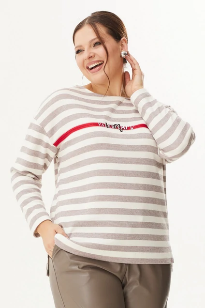 Стильный и комфортный джемпер свободного кроя, рукав слегка спущен. Горловина с округлым вырезом. По груди отделка декоративной тесьмой красного цвета. Джемпер выполнен из приятного к телу трикотажного полотна средней плотности. Принт в полоску. Длина джемпера от плечевого шва 70 см. Длина рукава 56 см.