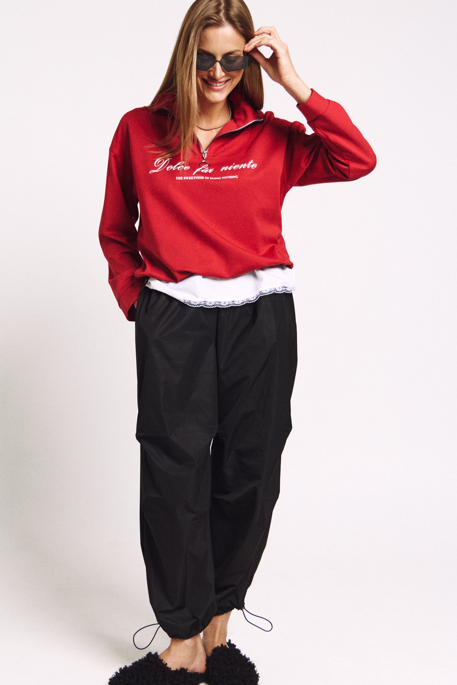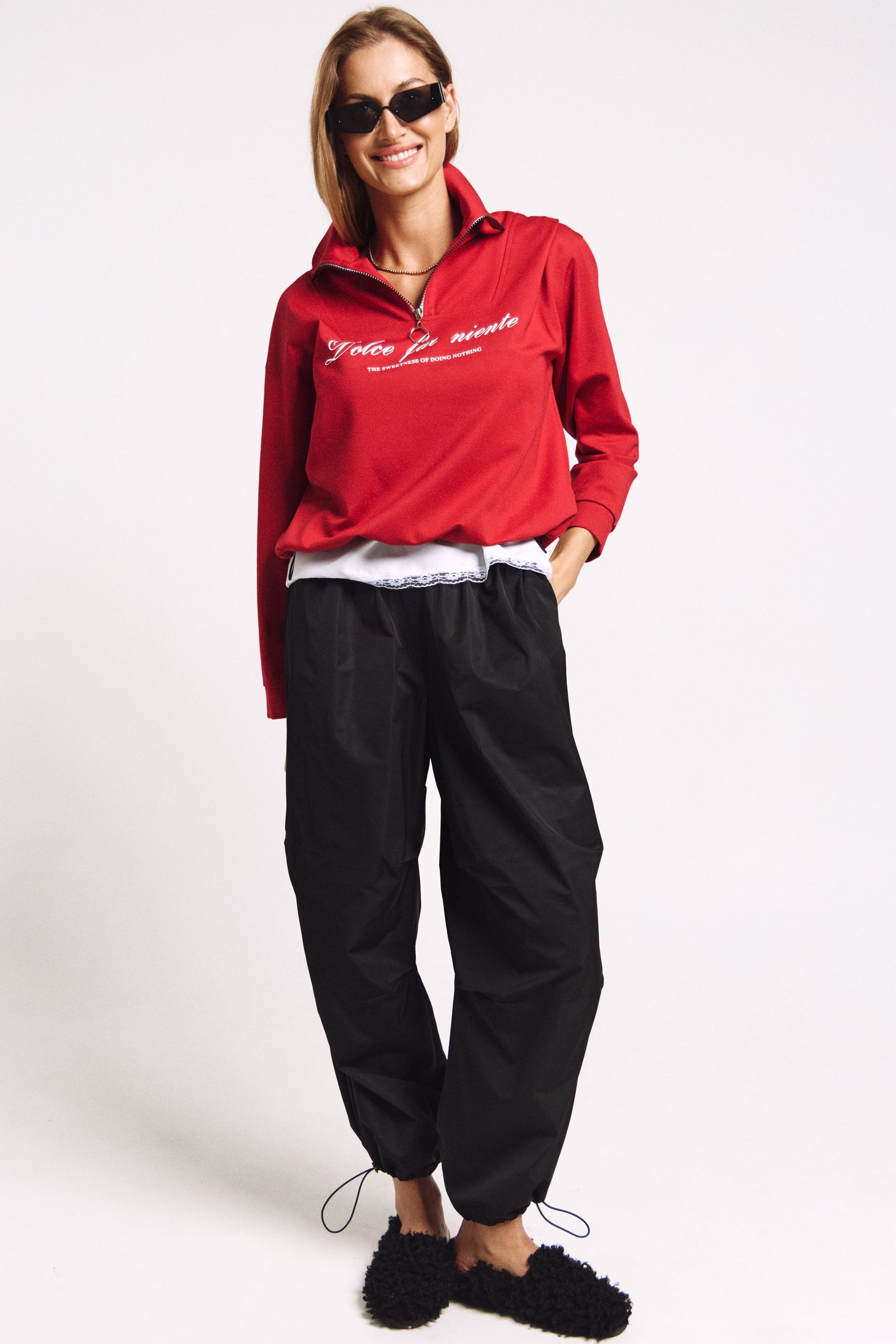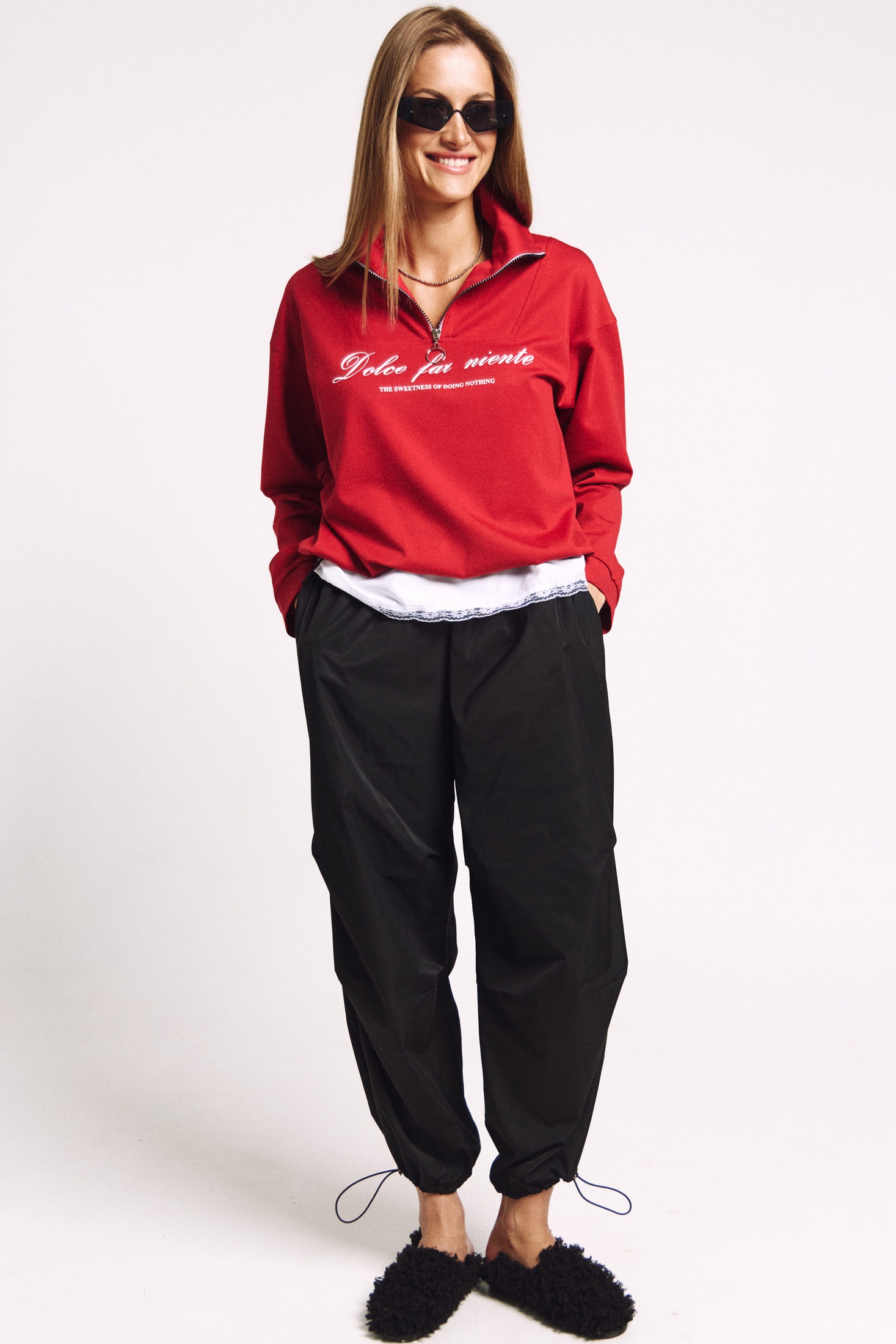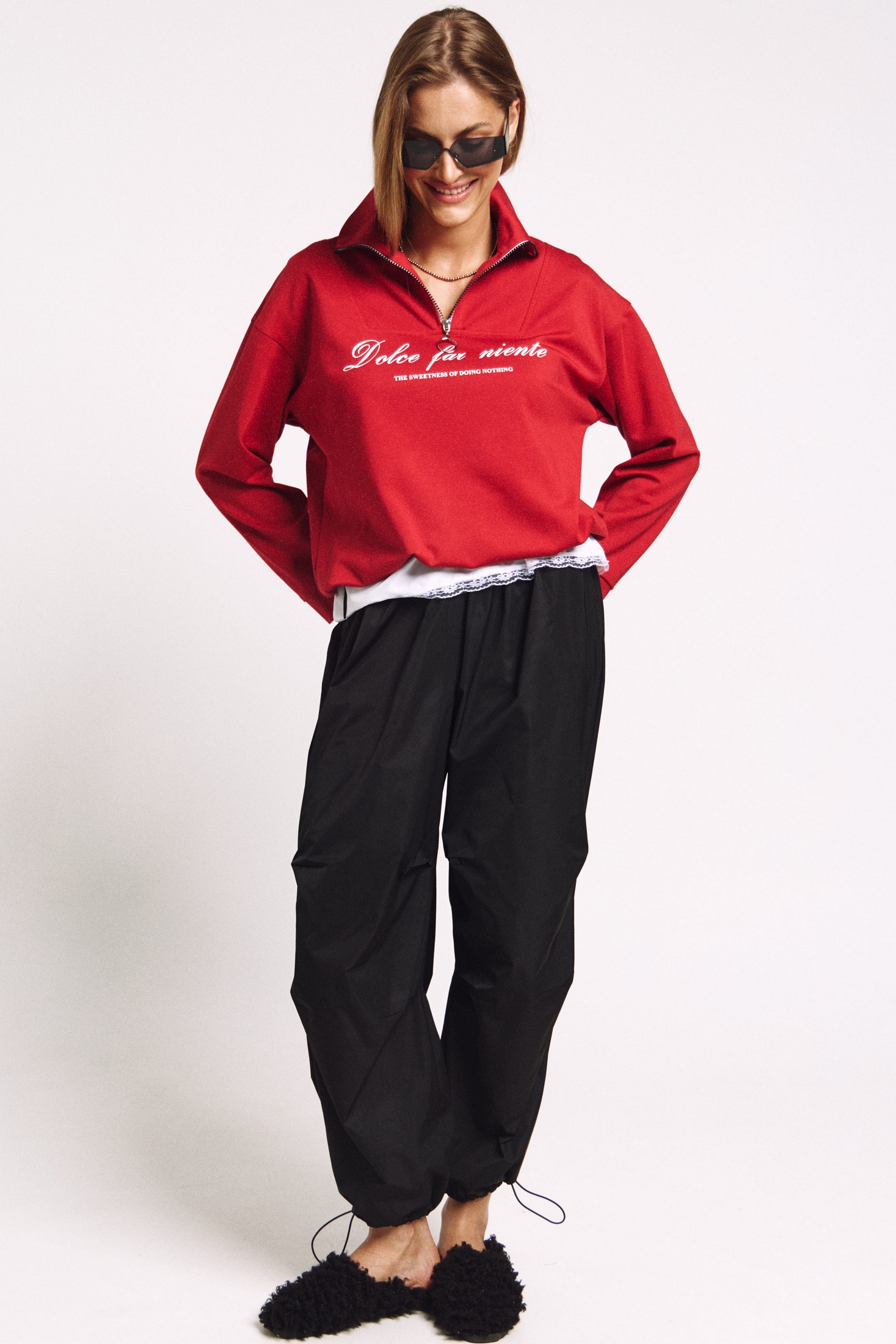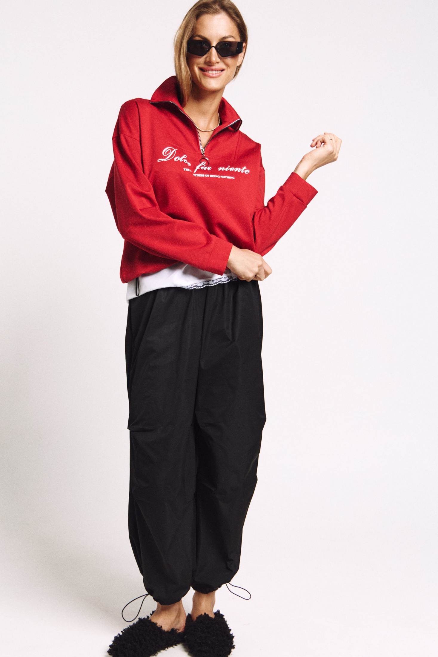 Джемпер в правильном красном цвете "скарлетт" со стойкой и молнией.