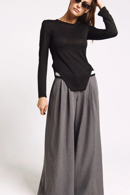 Изящный джемпер чёрного цвета, выполнен из фактурного трикотажа, который придаёт текстурность образу. Модель с длинными рукавами, вставными плечами и оригинальной фигурной линией низа. Этот лонгслив обладает прилегающим силуэтом, подчёркивающим изящество фигуры. Элегантная и универсальная вещь для создания стильных образов.