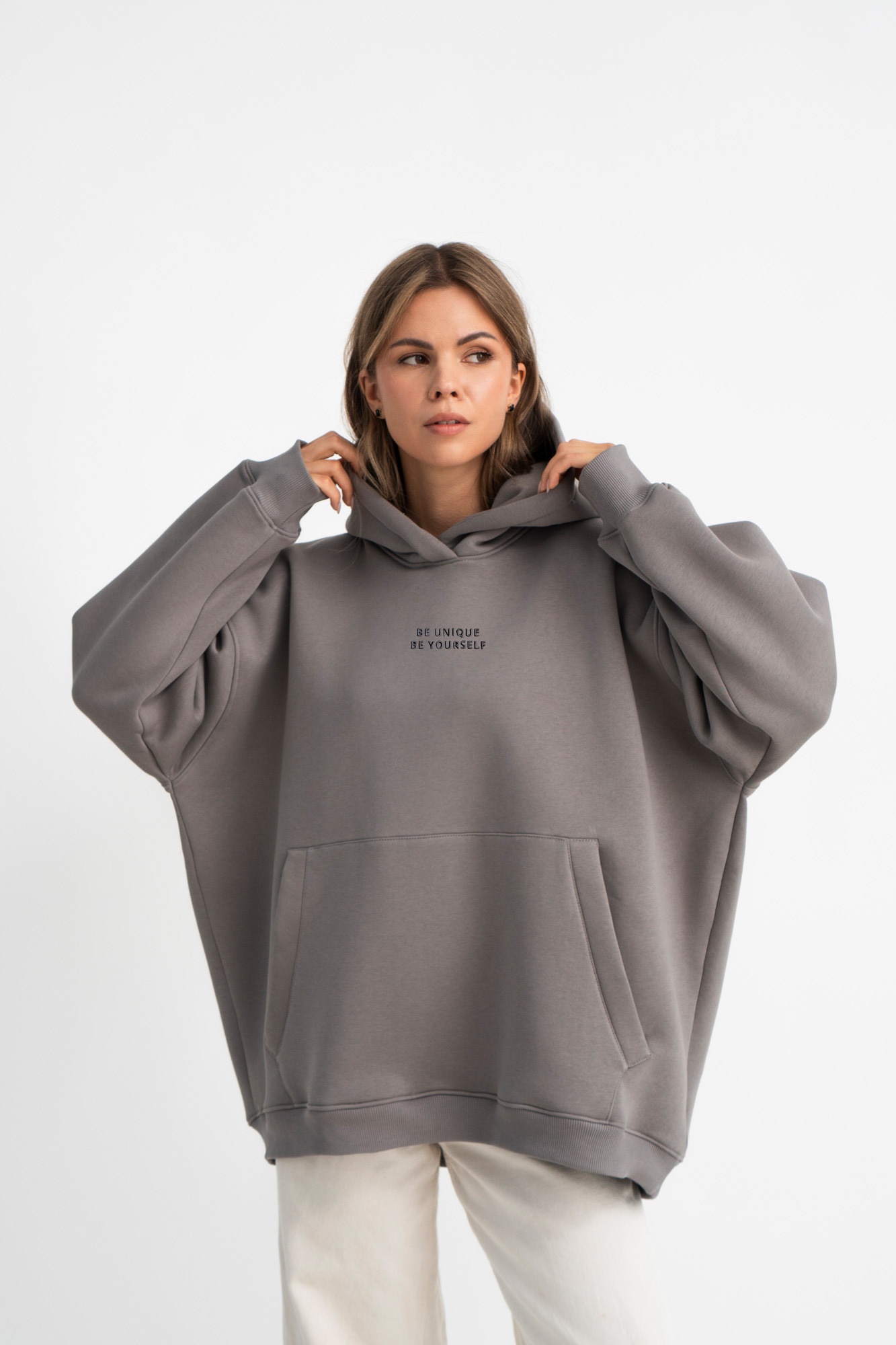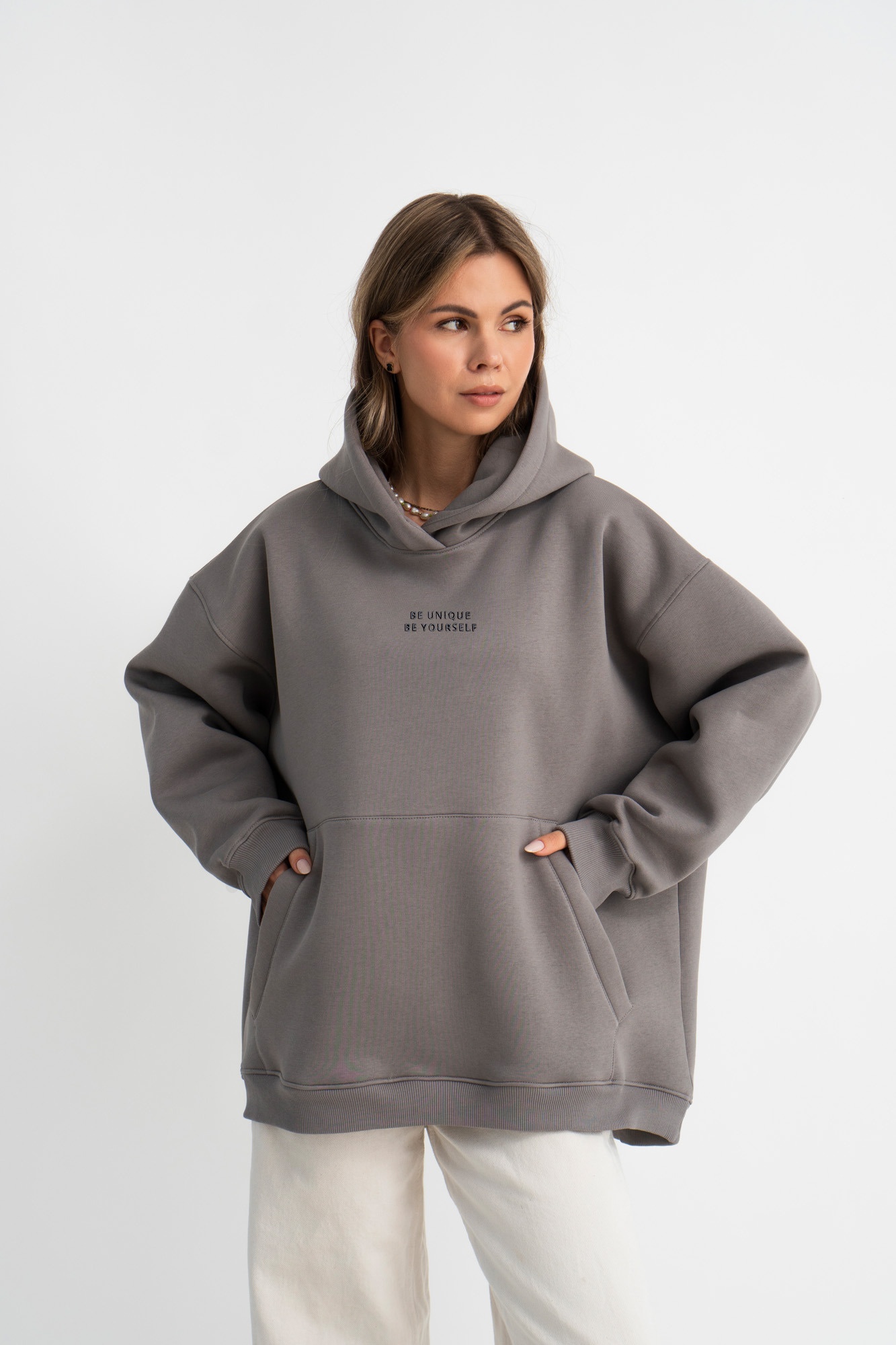 Утеплённый Худи изготовлен из качественного турецкого трикотажа. Ткань тёплая и приятная на ощупь , не пилингуется, с изнанки на флизе. Толстовка со спущенной линией плеча, свободного силуэта, с двойным капюшоном, по переду карман по типу “кенгуру”. Крой oversize позволяет чувствовать себя в нем очень комфортно и стильно! Вышивка спереди“Be unique Be yourself” (будь уникальным, будь самим собой) выделяет его среди других и выполнена с особой тщательностью.Мы примерили эту толстовку на самые разные фигуры: от 42 до 56, и она всегда выглядит великолепно.