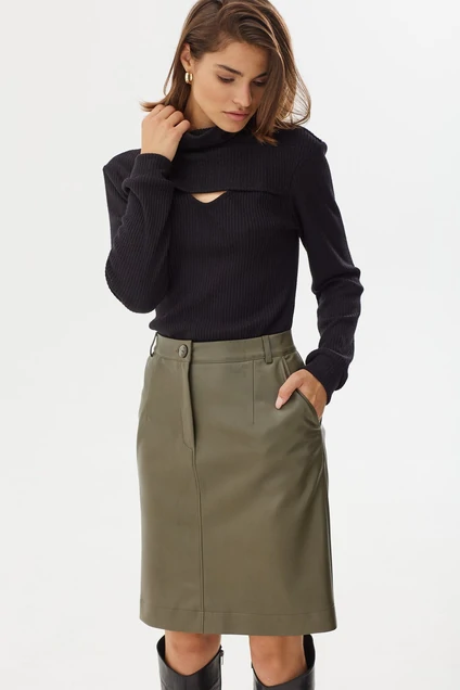 Стильный трикотажный джемпер из трикотажного полотна, модель полуприлегающего силуэта с открытыми плечами. Горловина и низ рукава декорированы планкой из основной ткани.