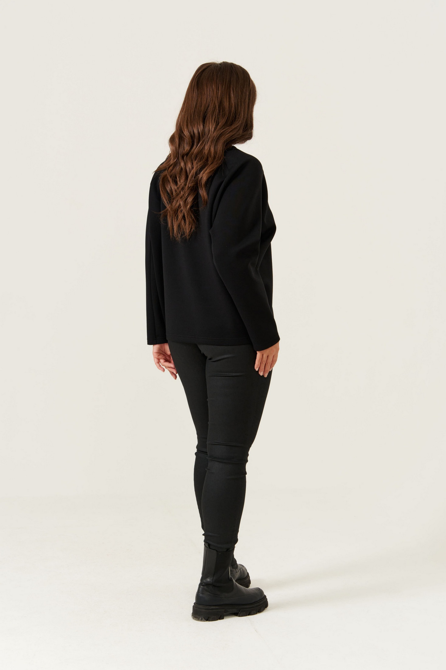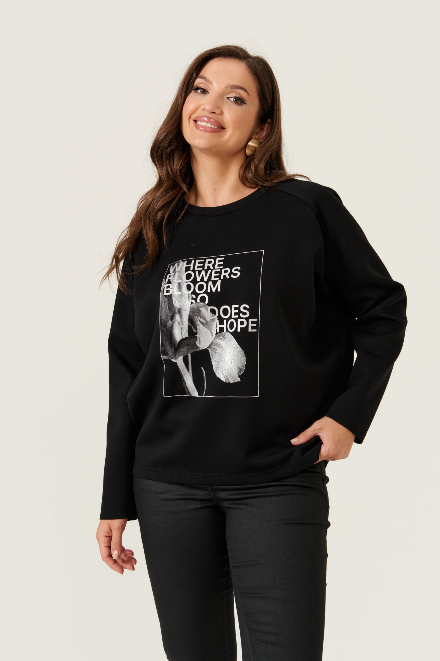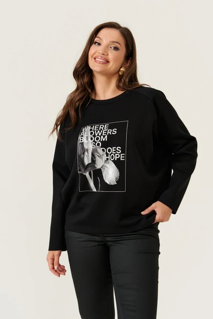 Этот женский джемпер выполнен из мягкого трикотажа с добавлением вискозы, что обеспечивает комфорт и приятные ощущения при носке. Модель прямого силуэта подходит для разных типов фигуры и легко сочетается с различными образами. Перед украшен дизайнерской печатью с интересным принтом и надписью, что придает изделию индивидуальность и стиль. Горловина чуть расширенная, обработана притачной тесьмой, что добавляет аккуратности и завершенности образу. Рукава реглан создают свободный крой и комфорт при движении. Классическая длина делает этот джемпер универсальным элементом гардероба. В чёрном цвете он отлично подойдет под любой наряд, а его идеальная посадка подчеркнет вашу фигуру и привлечет восхищенные взгляды окружающих.