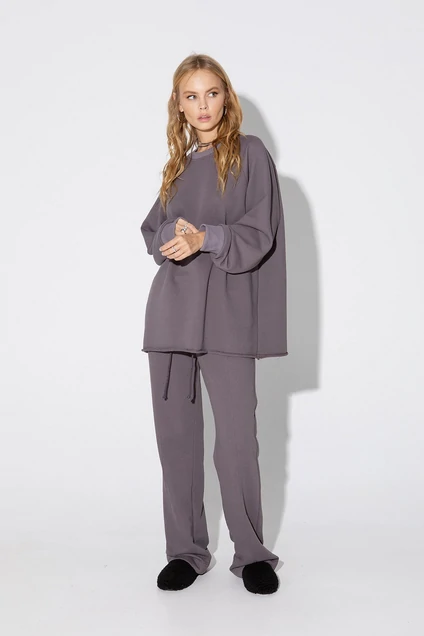 Трикотажный удлиненный свитшот с необработанным краем. Детали: свитшот прямого силуэта, спущенная линия плеча, рукава длинные с притачными манжетами, низ переда и спинки с необработанным краем.