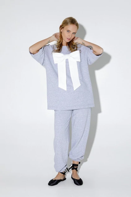 Трикотажный свободный джемпер с бантом. Детали: джемпер прямого силуэта, спущенная линия плеча, круглая горловина переда и спинки, кокетка переда, рукава короткие, без застежки.