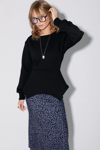 Детали: джемпер полуприлегающего силуэта, спущенная линия плеча, круглый вырез горловины, талия на резинке, застежка на потайную молнию в среднем шве спинки, рукава длинные с манжетами, фигурный низ. Джемпер из трикотажа футер трехнитка с начёсом.