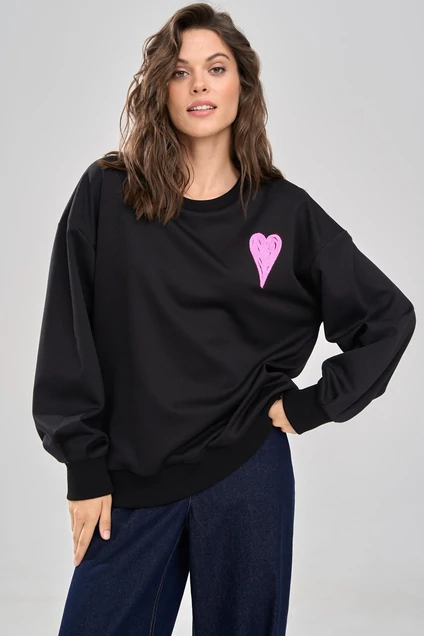Джемпер свободного кроя, низ изделия присборен на пояс, рукав длинный расширеный, заканчивается манжетом. По переду на груди авторская вышивка в виде сердца.