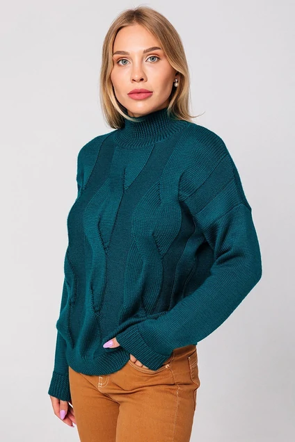 Женский, уютный, мягкий, базовый джемпер прямого силуэта. Изготовлен из высококачественной дышащей пряжи, цвета не линяют, легкий в уходе. Свободный и эргономичный крой. Модель oversize (оверсайз), спущенная линия плеча. Приятный на ощупь. Горловина-стойка - стильная изюминка и трендовый элемент этого джемпера. Широкие косы визуально вытягивают силуэт. Подойдет как для офиса, так и для прогулок с друзьями. Носи его с классическими брюками и брюками палаццо, джинсами, юбками и шортами. Дополни образ сумкой и ботинками.
