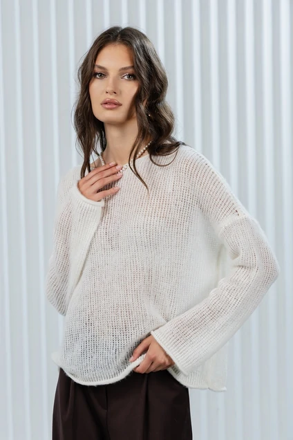Ажурный вязаный узор — добавляет изысканности и лёгкости, делая джемпер универсальным для разных стилей.