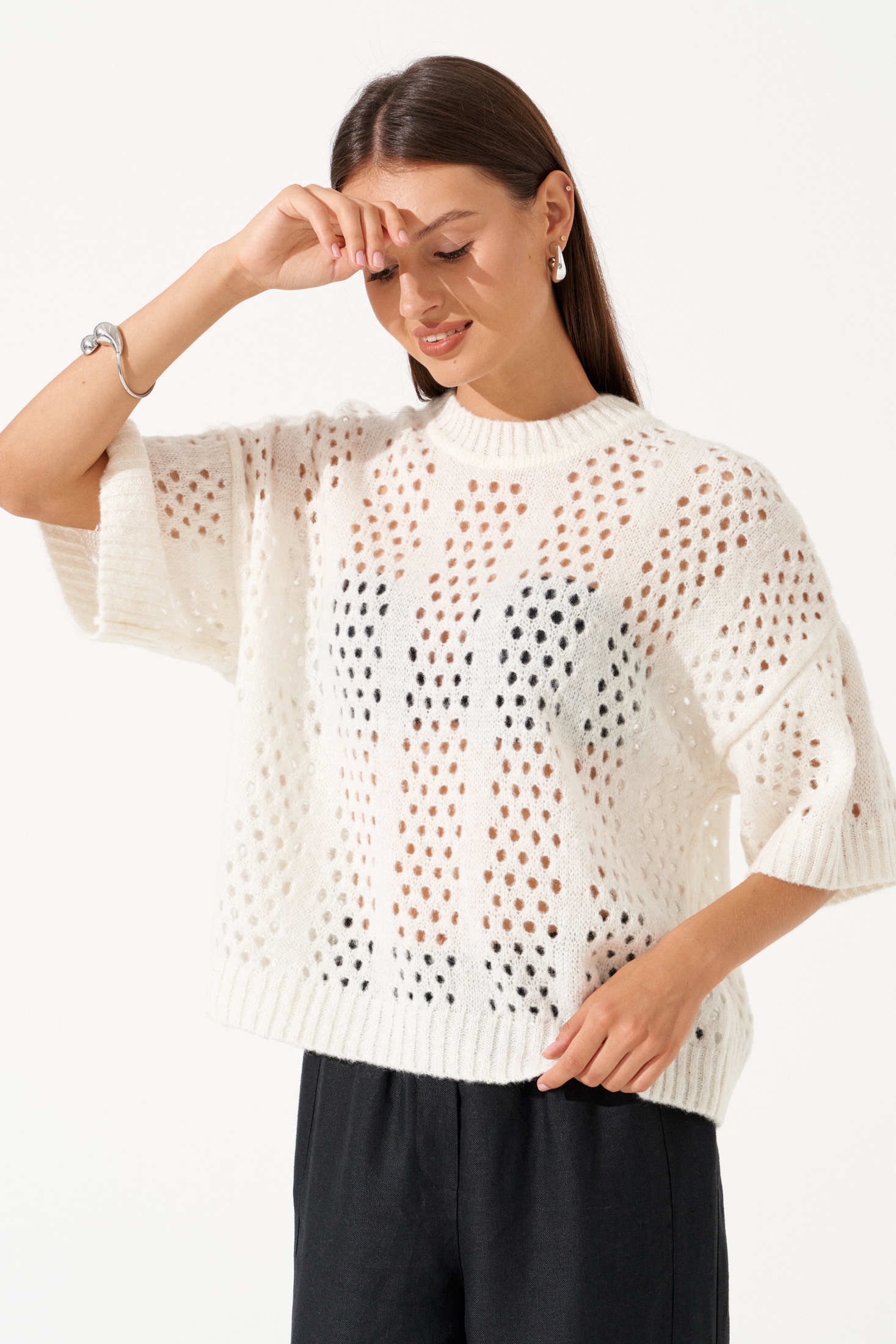 Джемпер РВ0397-АК4 молочный Romgil — это идеальный выбор для летнего сезона. Коллекция бренда Romgil сочетает в себе легкость и комфорт, благодаря крупной вязке с узором 'сетка'. Изготовленный в молочном цвете, он добавляет свежести и своей легкости вашему образу. Короткие рукава и свободный крой позволяют коже дышать, а высокая горловина обеспечивает комфорт в прохладные вечера. Стильный и воздушный, этот джемпер подойдет для повседневного или вечернего выхода, добавляя нотки непринужденности и современного стиля. Его можно комбинировать с различными элементами гардероба для более прохладных осенних или весенних дней.