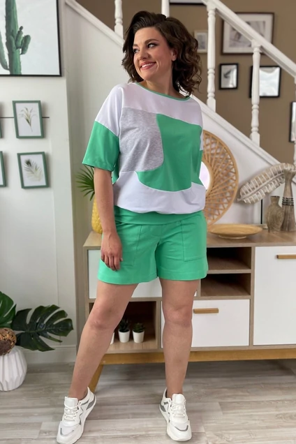 Джемпер женский из трикотажной ткани. Прямого силуэта. Перед и спинка джемпера оформлена декоротивными подрезами. Спущенное плечо. Рукав 3/4. Низ джемпера обработан притачной планкой.