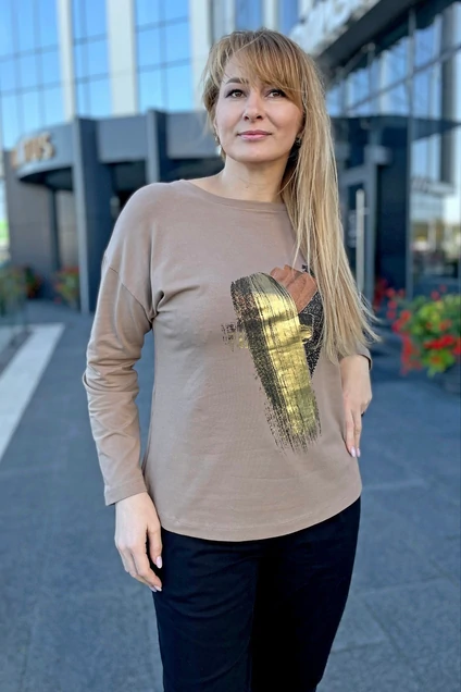 Джемпер женский из трикотажной ткани прямого силуэта. По переду расположен принт, спинка со средним швом. Рукав одношовный, спущенный. Вырез горловины-круглый, обработан бейкой.