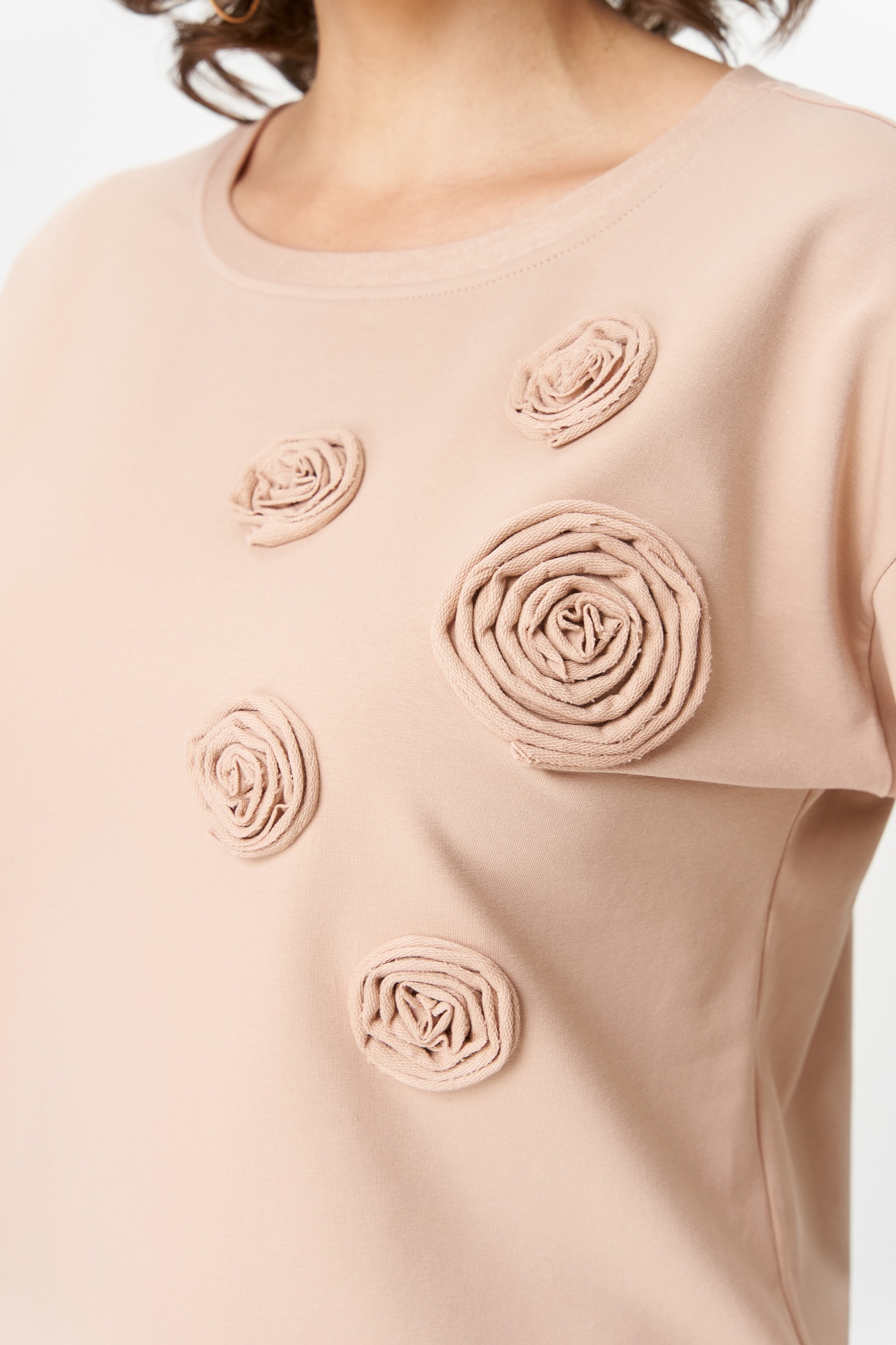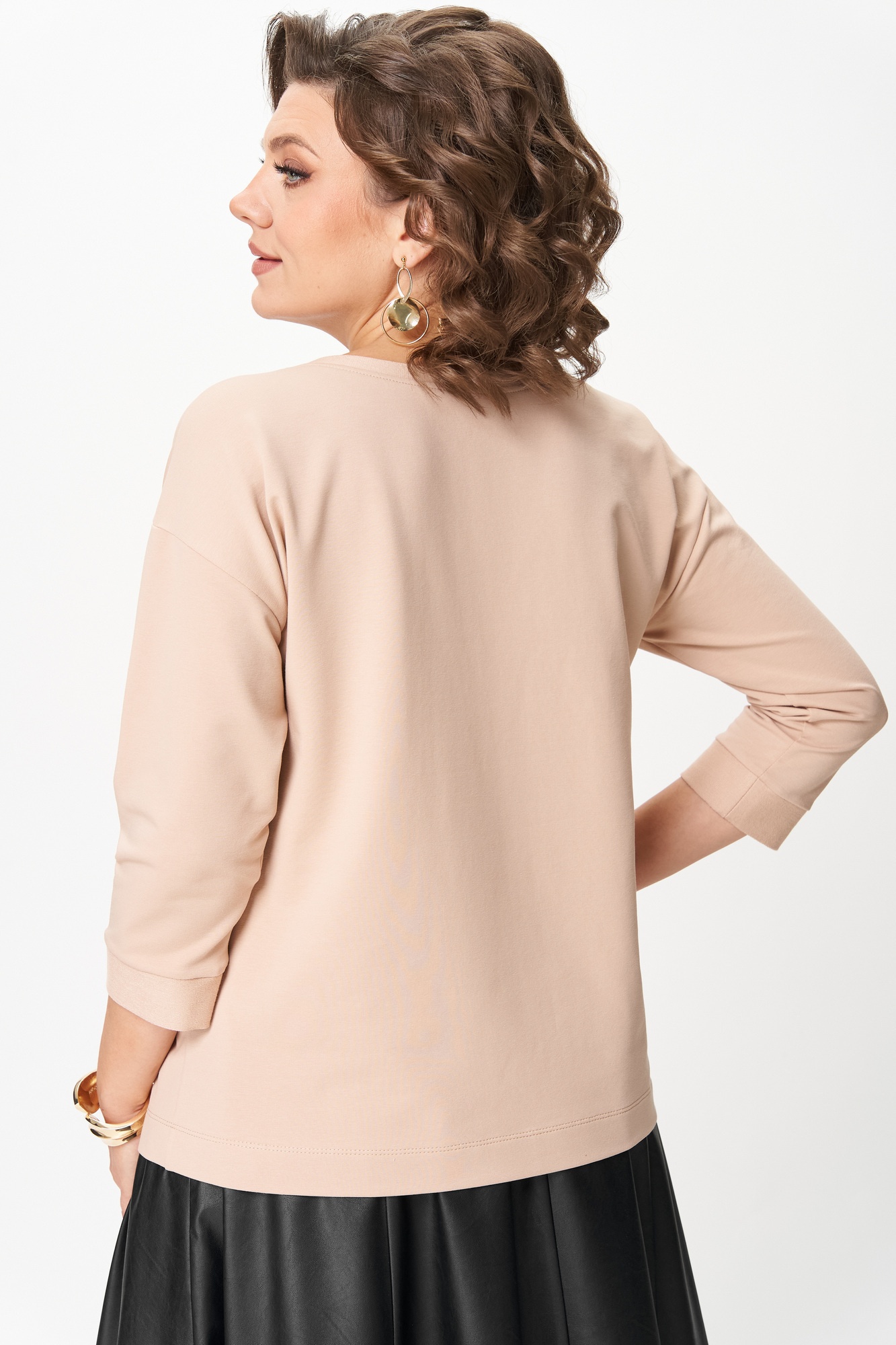 Джемпер женский из трикотажной хлопковой ткани (двунитка). По переду джемпера расположены декоративные элементы. Спущенное плечо, рукав 3/4. Низ рукава обработан манжетой. Вырез горловины круглый, оформлен бейкой.