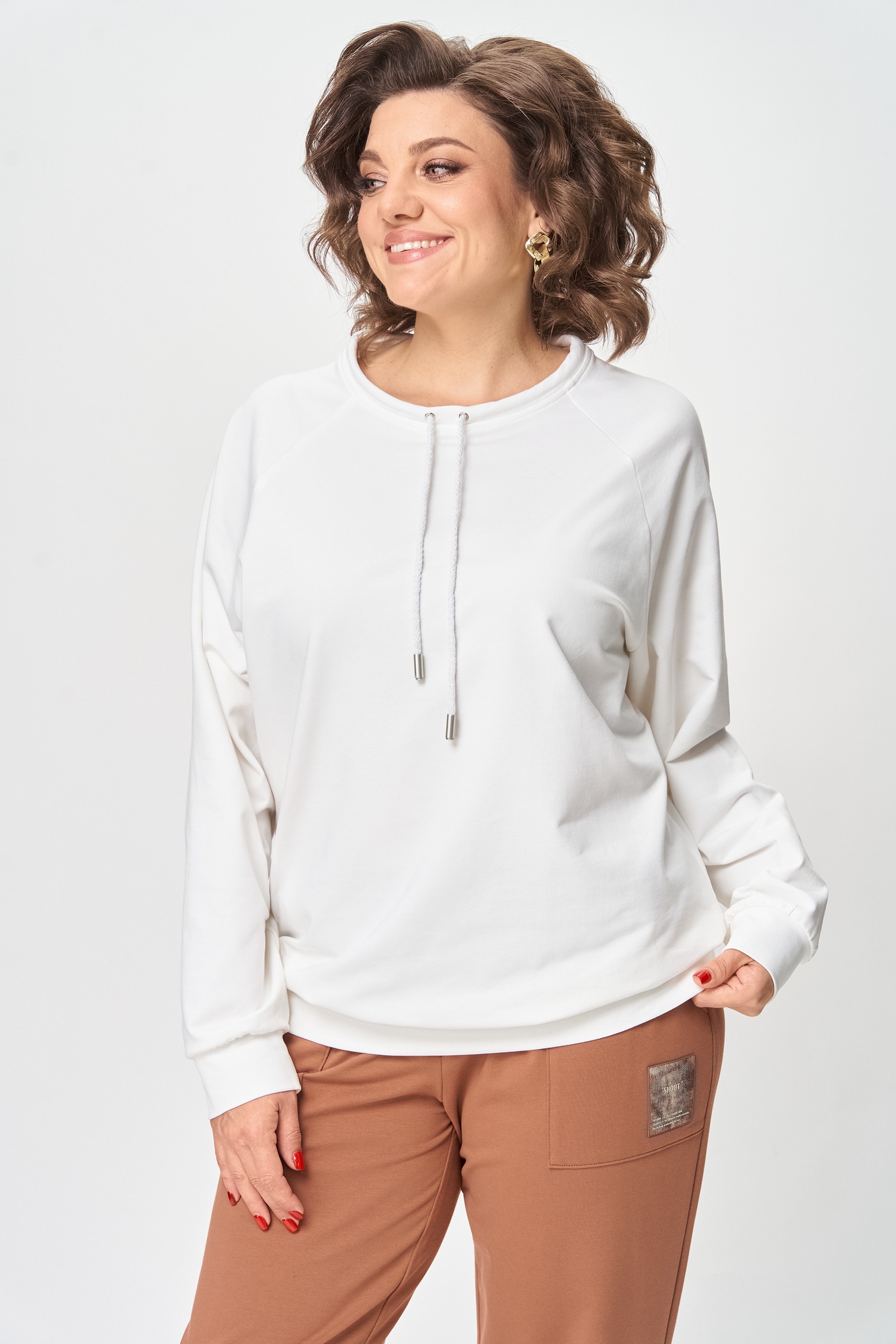 Джемпер женский из трикотажной хлопковой ткани (двунитка). Рукав реглан. Низ рукава обработан притачной манжетой. Низ изделия оформлен притачным поясом. На спинке настрочен декоративный элемент. Вырез горловины круглый, обработан бейкой со шнуром.