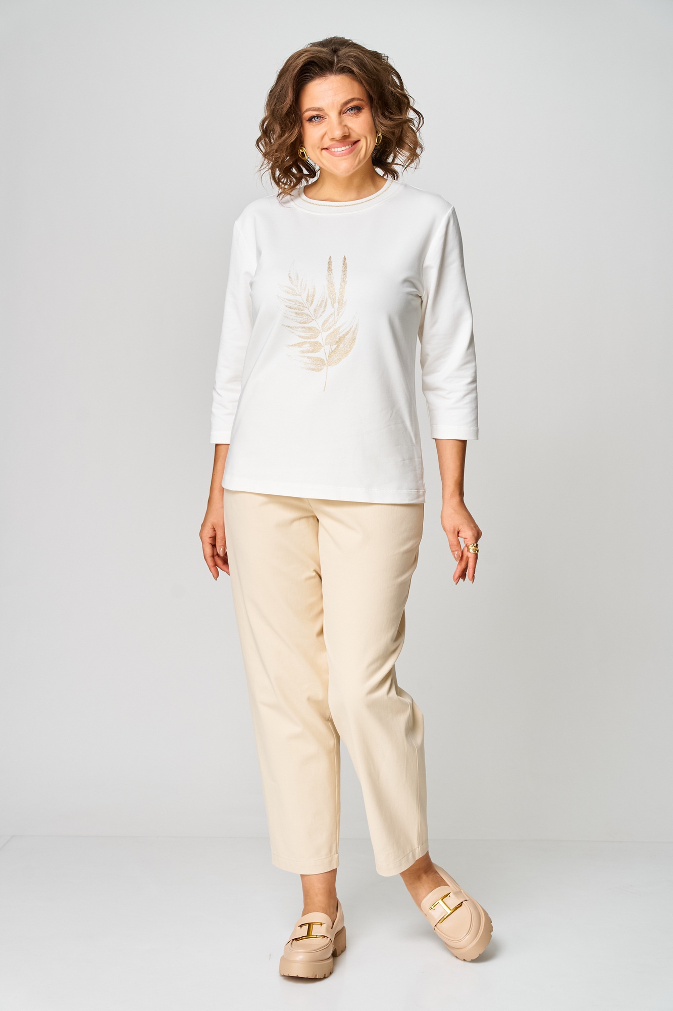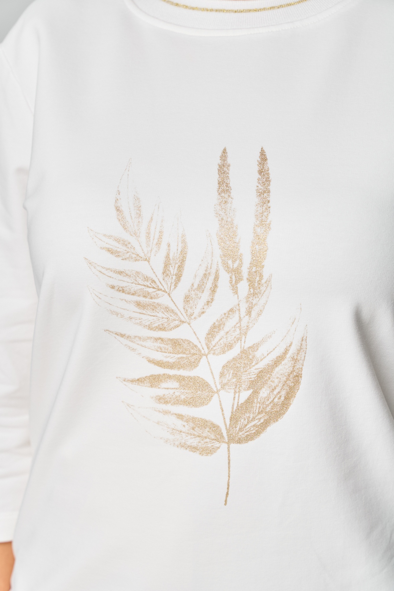 Джемпер женский из трикотажной хлопковой ткани (двунитка). По переду расположен принт. Рукав прямой втачной. Рукав 3/4. Вырез горловины круглый, обработан довязом.