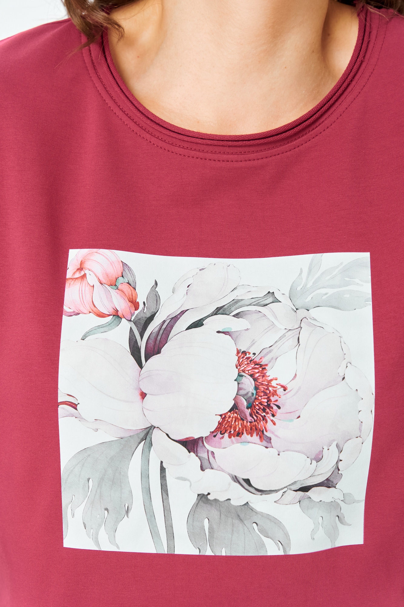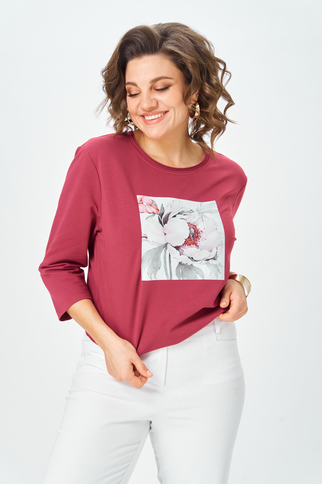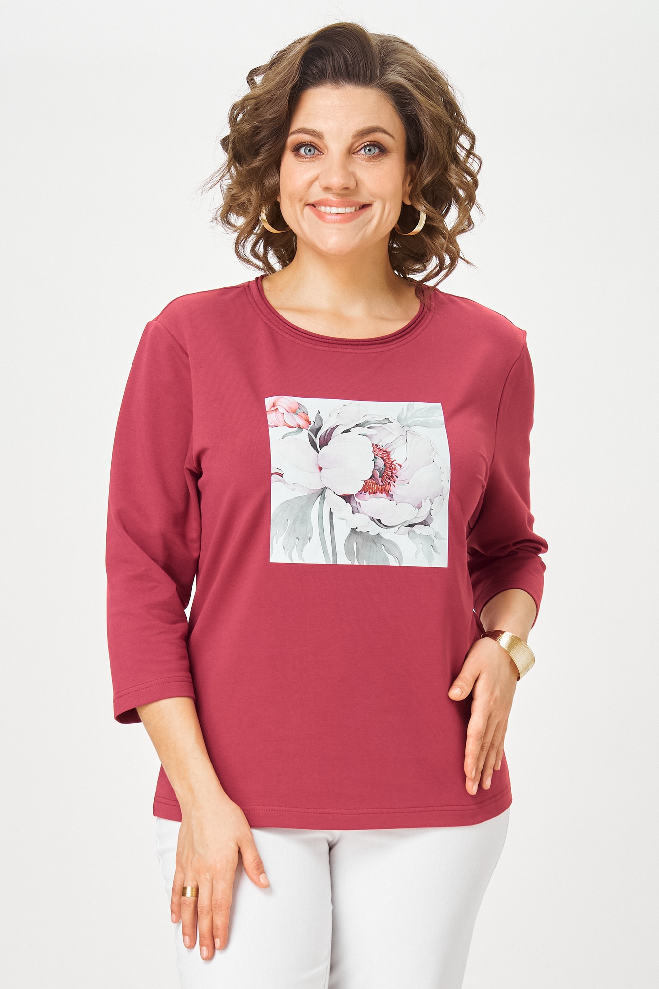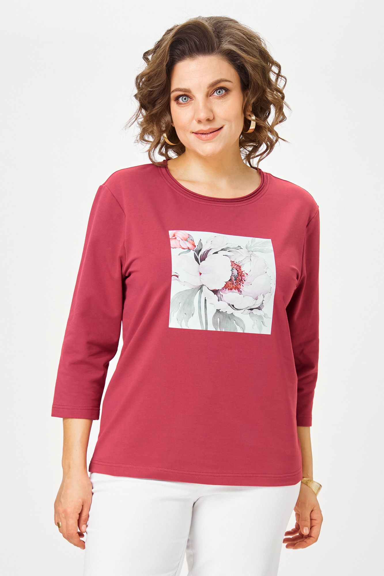 Джемпер женский из трикотажной хлопковой ткани (двунитка). По переду расположен принт. Рукав втачной 3/4, прямой. Вырез горловины круглый, оформлен бейкой с необработанными краями.