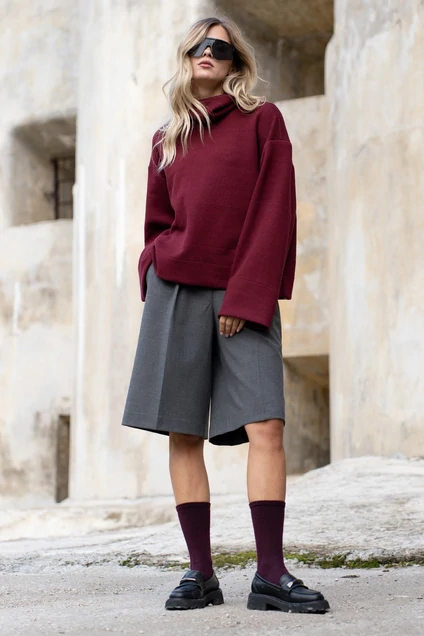 Джемпер оверсайз с длинным рукавом на спущенной пройме. Горловина округлой формы с объемным воротником стойкой. Изделие выполнено из фактурного, мягкого трикотажа ( полосы ). Длина джемпера по центру спинки 57см. Длина рукава от горловины 72см. ( длина плечевого шва 19см + длина рукава от проймы 53 см.) Высота стойки 16 см. Ширина по низу в полуобхвате +-65см. ( 46р ) Ширина рукава в полуобхвате +-19 см. ( 46р. )