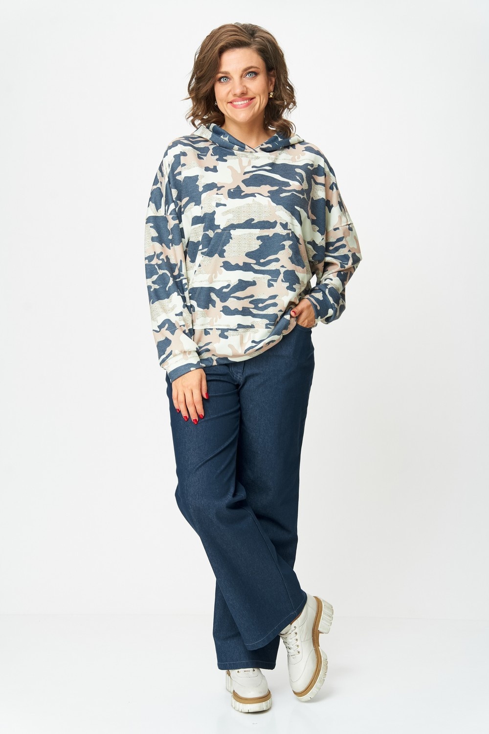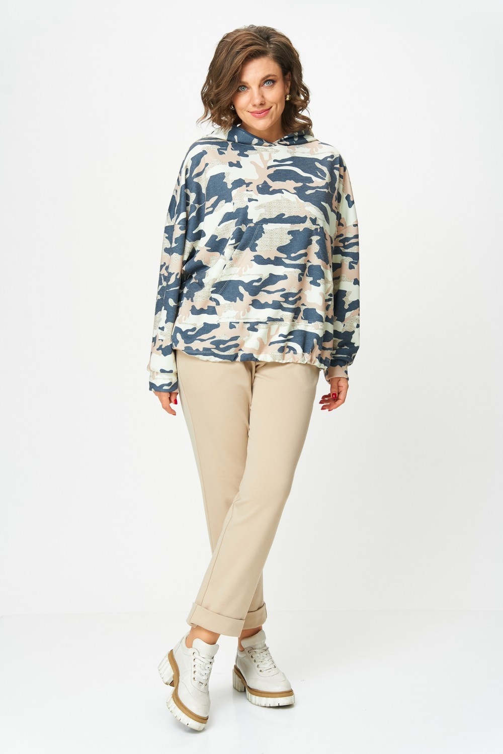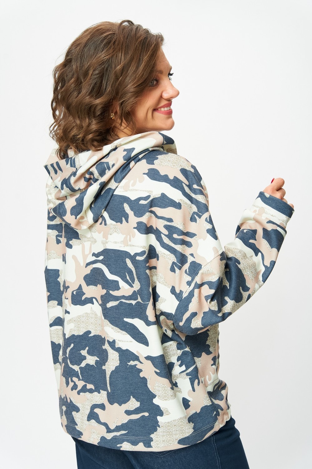 Эта стильная женская толстовка оверсайз выполнена в модном камуфляжном принте с нейтральной цветовой палитрой, включая оттенки синего, коричневого и бежевого на светлом фоне. Модель обладает уютной горловиной с капюшоном и длинными втачными рукавами с притачными манжетами. Линия плеча спущена, добавляя образу расслабленность. Удобный карман-кенгуру на передней части дополняет функциональность, а регулируемая ширина по низу с помощью фиксаторов с резинкой обеспечивает комфортное прилегание. Длина толстовки по спинке составляет 65 см, а длина рукава от горловины — 76 см, что делает её идеальным выбором для повседневной носки.