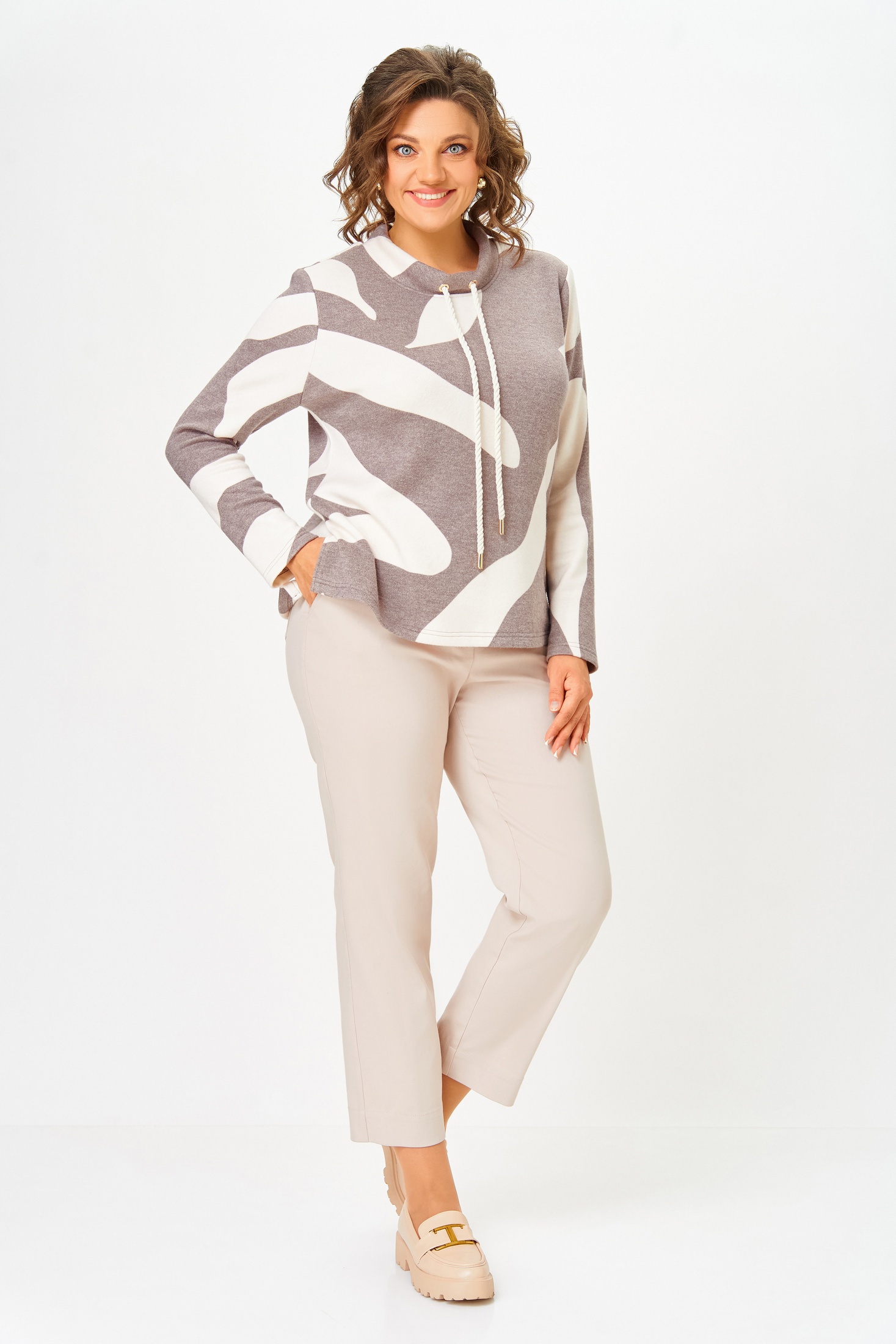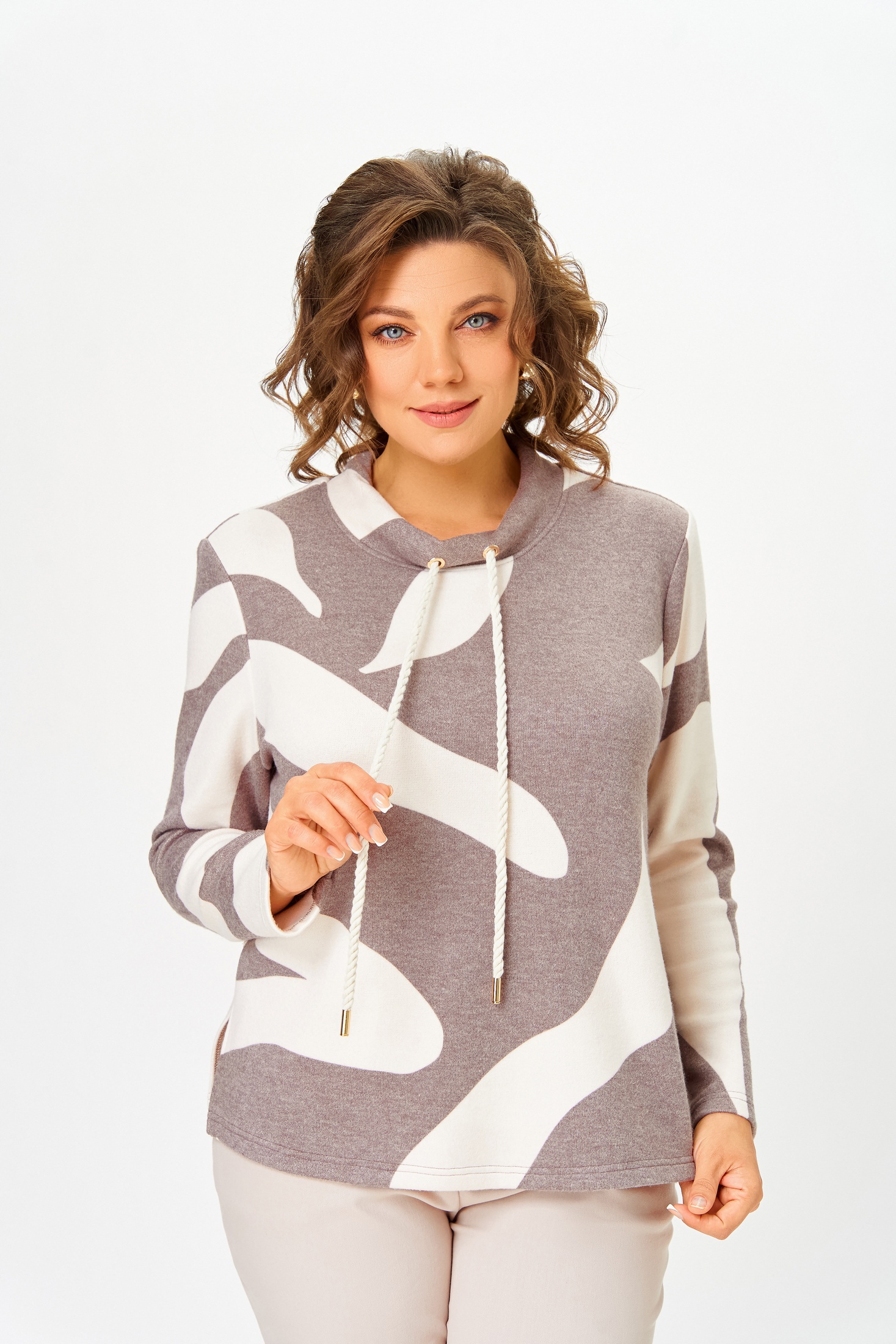 Джемпер из мягкого вискозного трикотажного полотна прямого силуэта, слегка расширен к низу. Перед и спинка цельные, в боковых швах разрезы длиной 11 см.