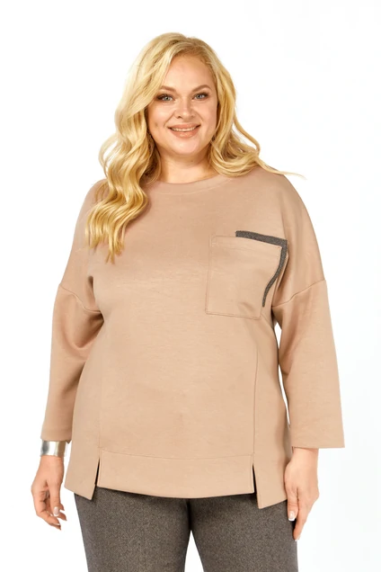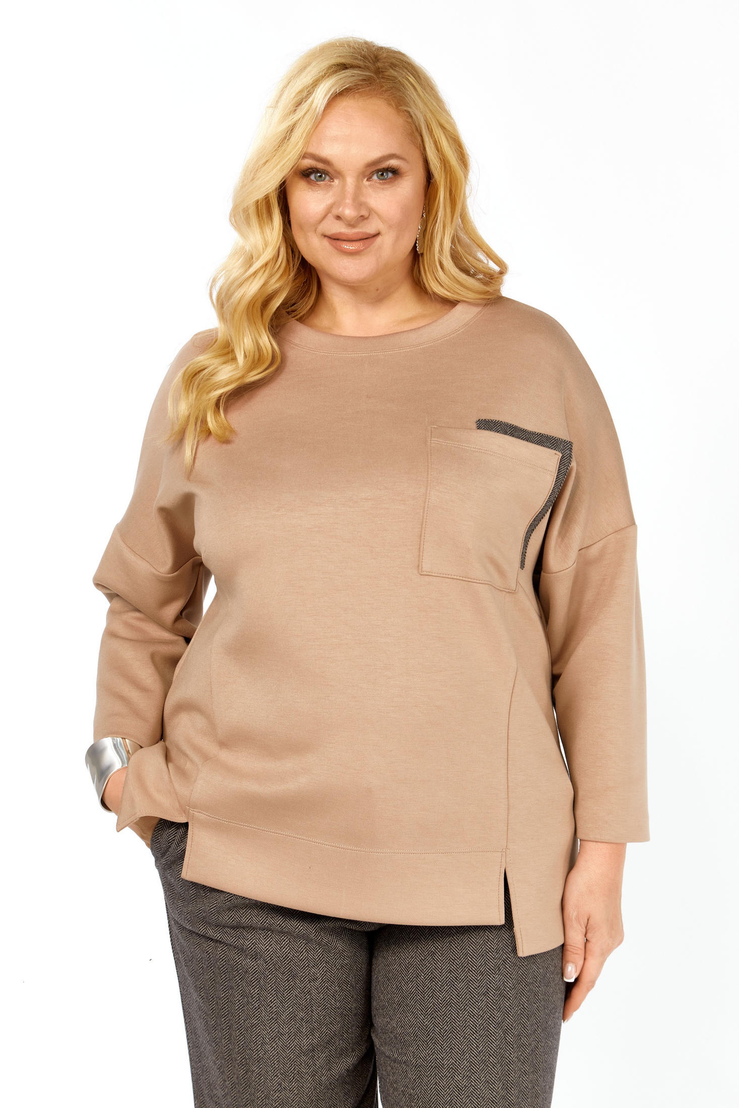 Очень удобная, уютная блуза из трикотажного полотна. Изделие полуприлегающего силуэта. Горловина аккуратной округлой формы. Рукав втачной, линия плеча спущена полной длины. Декоративным элементом является накладной карман, который выполняет не только практичную, но и эстетичную функцию, добавляя изделию стиль и индивидуальность. Низ ассиметричный в боковых швах предусмотрены разрезы. Спинка со средним швом