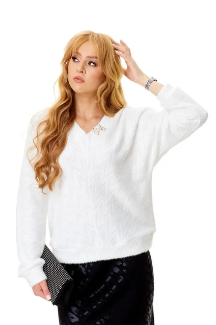 Мягкий пушистый джемпер из трикотажа с ангоркой свободного силуэта, не приталенный. Горловина V-образная. Рукав длинный цельнокроеный, зауженный к низу, собран на манжетку. По низу джемпера планка. Брошь декоративная в комплекте.