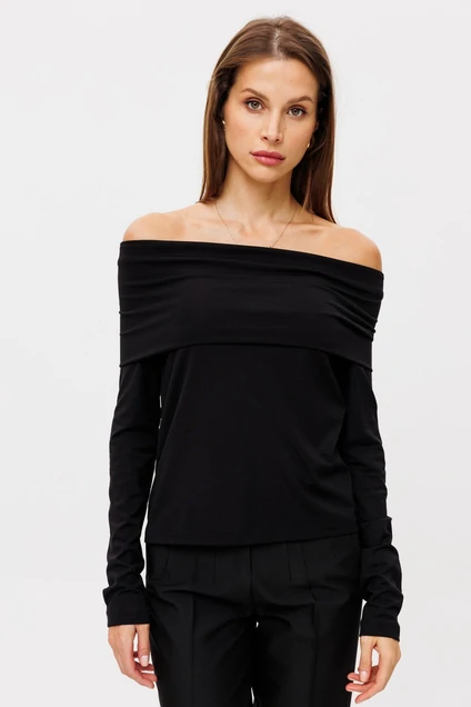 Джемпер прилегающего силуэта со спущенными открытыми плечами и длинными рукавами, рукав втачной. Джемпер выполнен из мягкой плотной вискозы.Спущенные плечи делают акцент на шее и ключицах. Длина рукава 65 см от плеча, длина изделия по спинке 48 см без учета декоративного элемента, полуобхват груди 39 см в 42-м размере.
