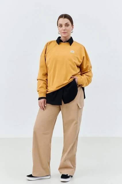 Свитшот женский оверсайз силуэта, удлиненный. Спущенная линия плеча добавляет комфортности в эксплуатации. Слева по переду нашита лейба с названием бренда.Ширина по бедрам -65