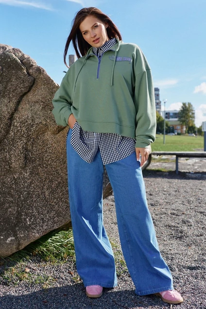Свитшот -поло женский прямого силуэта силуэта из плотного трикотажа с застежкой на контрастую молнию.Спущенная линия плеча добавляет комфортности в эксплуатации. Воротник стойка с удобными завязками виде шнурка. Рукава длинные с манжетой -напульсником. Сбоку спереди эффектная вышивка в цвет молнии