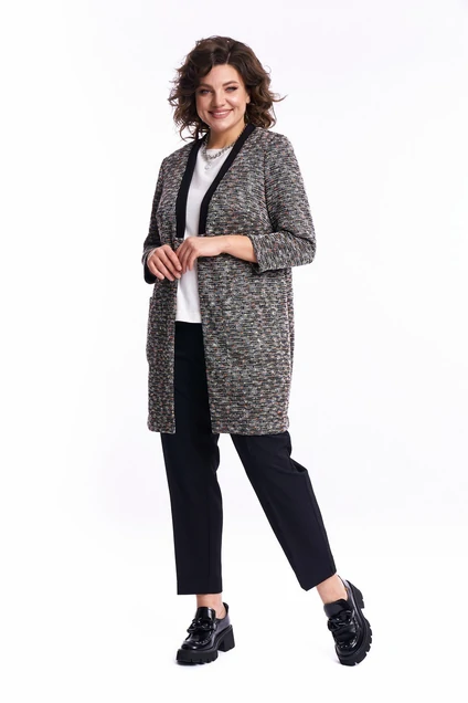 Женский кардиган из трикотажного полотна без подкладки, прямого силуэта. По горловине планки из довяза, без застежки. На полочках накладные карманы. Рукав втачной - 3/4. Длина по спинки - 86 см, длина рукава - 51 см. 50 размер: ОГ -108 см, ОТ - 106см, ОБ - 114см. 52 размер: ОГ -112 см, ОТ - 110см, ОБ - 118см, 54 размер: ОГ -116 см, ОТ - 114см, ОБ - 122см.