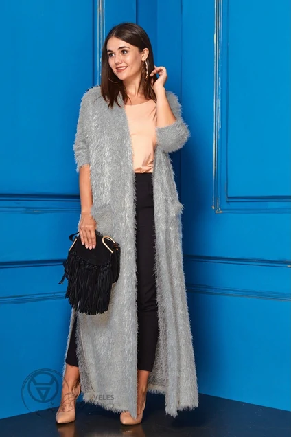 Кардиган из трикотажного полотна с ворсом. Кардиган длиной до косточки,без застежки.По полочке настрочены два кармана. По боковым швам-разрезы. Рукав одношовный,длинный,втачной. В горловину и край борта втачана планка. Длина изделия-(50-54)-138см.,(56-60)-140 см. Длина рукава(50-54)-61см.,(56-60)-62см.
