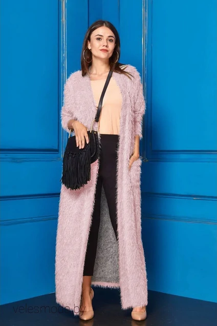 Кардиган из трикотажного полотна с ворсом. Кардиган длиной до косточки,без застежки.По полочке настрочены два кармана. По боковым швам-разрезы. Рукав одношовный,длинный,втачной. В горловину и край борта втачана планка. Длина изделия-(50-54)-138см.,(56-60)-140 см. Длина рукава(50-54)-61см.,(56-60)-62см.