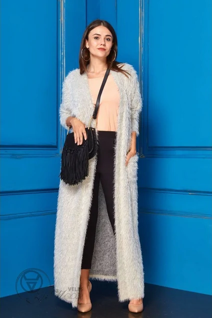 Кардиган из трикотажного полотна с ворсом. Кардиган длиной до косточки,без застежки.По полочке настрочены два кармана. По боковым швам-разрезы. Рукав одношовный,длинный,втачной. В горловину и край борта втачана планка. Длина изделия-(50-54)-138см.,(56-60)-140 см. Длина рукава(50-54)-61см.,(56-60)-62см.