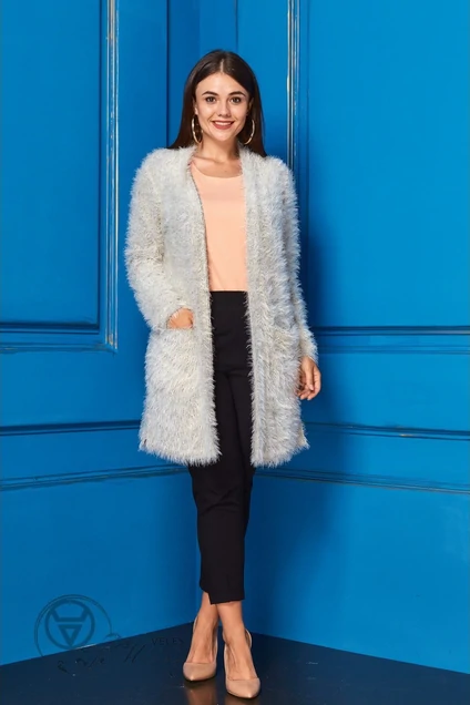 Кардиган женский из трикотажного полотна с ворсом-"мех". Кардиган средней длины. По полочке накладные карманы. По боковым швам-разрезы, рукав одношовный. По краю горловины идет планка. Длина кардигана :(50-54)-86см.,(56-60)-93см. Длина рукава-(50-54)-62см.,(56-60)-62см.