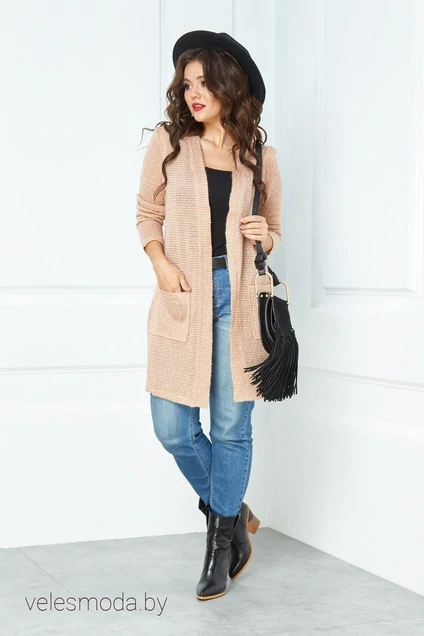 Кардиган женский из трикотажного вязаного полотна . Кардиган средней длины. По полочке накладные карманы. По боковым швам-разрезы, рукав одношовный. По краю горловины идет планка.В комплекте идет сьемный пояс. Длина кардигана :(50-54)-86см.,(56-60)-93см. Длина рукава-(50-54)-62см.,(56-60)-62см.