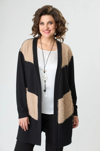 Кардиган прямого силуэта, выполнен из трикотажного полотна двух видов, контрастных по цвету и структуре. Кардиган удлененный. Полочка кардигана выполнена из деталей с разной структурой трикотажа, чередующихся между собой. Горловина v-образной формы, переходит в борт полочки. Горловина и борт полочки обработаны планкой. Спинка цельная. В нижней части боковых швов обработаны разрезы. Пройма кардигана углубленной формы. Рукав рубашечного типа, одношовный, длинный.
