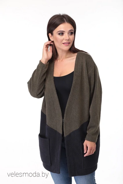Кардиган женский выполнен из трикотажного полотна в рубчик двух цветов. Прямого, свободного силуэта, длиной закрывающей бедра. Полочка с центральной застежкой на потайную навесную петлю и пуговицу. В нижней части полочки диагональный подрез, накладной карман входит в боковой шов. Пройма спущеной формы, рукав длинный, одношовный, объемный в области плеча и заужен к низу. Спинка цельная.