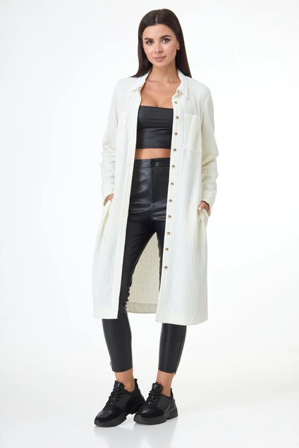 Полуприлегающий силуэт, втачной длинный рукав, воротник сорочечного типа, застежка на пуговицы по всей длине. Нагрудные накладные карманы. В боковых швах функциональные карманы, внизу фигурные разрезы со сложной технологической обработкой. Дополнен съёмным завязывающимся поясом.