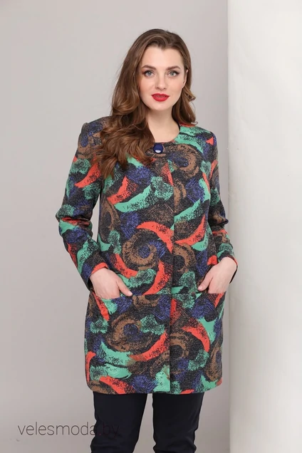 Кардиган женский прямого силуэта. Может использоваться как верхняя одежда, так и как жакет. Жакет с потойной застежкой. Перед жакета с подрезами ниже линии талии, в котороых расположены камраны. Горловина полукруглой формы без воротника. Рукав двухшевный. Кардиган выполнен на подкладке. Длина изделия по среднему шву спинки - 84 см., длина рукава - 62 см..