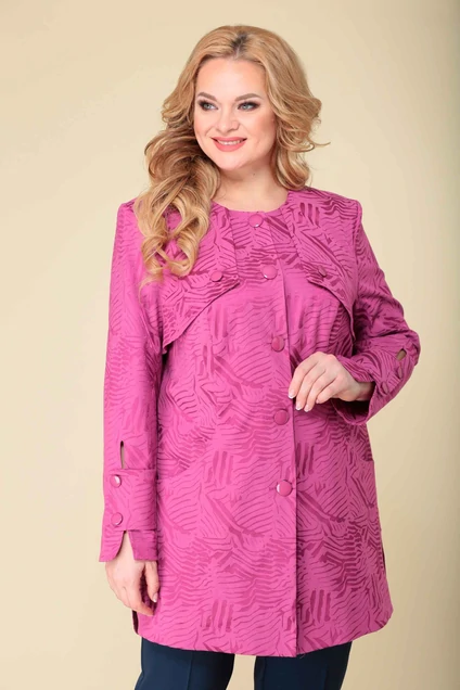 Женский кардиган полуприлегающего силуэта, из костюмной стрейчевой ткани с абстрактным рисунком. Рукав с разрезом на пату с пуговицами, Горловина круглая. Перед с рельефами с карманами в области бедер. Застежка по переду центральная на петли и пуговицы. Вырез кокетки с пуговицами. Спинка с кокеткой, из под которой имитация застежки на пуговицы, по низу шлица. Низ кардиганы фигурный с разрезами по боковым швам. Длина изделия: 84 (±1) см.Силуэт: полуприлегающий Рукав: длинный Длина рукава: 61.5 (±2) см.