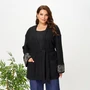 Пояс, завязывающийся на талии, подчеркивает фигуру и добавляет изысканности, позволяя регулировать силуэт по вашему желанию. Манжеты рукавов декорированы изящной вышивкой, которая добавляет уникальности и ручной работы в дизайн изделия. Это делает кардиган не только функциональным, но и стильным аксессуаром, который легко сочетать с различными нарядами — от повседневных до вечерних.