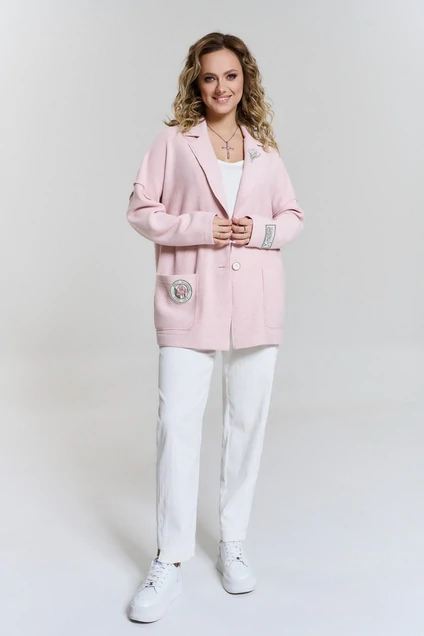Кардиган из мягкого ворсистого трикотажа, свободного силуэта, застежкой на пуговицы и воротником пиджачного типа. Рукав длинный, линия плеча спущена. На переде накладные карманы. Некоторые швы в изделии выполнины налицо. Кардиган декорирован нашивками с авторской вышивкой.