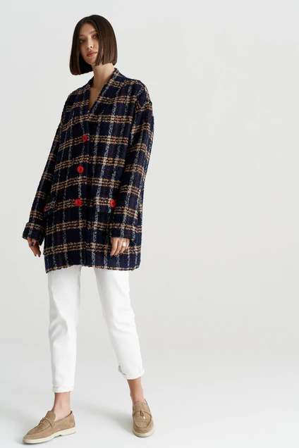 Кардиган женский выполнен из трикотажного полотна крупной вязки. Кардиган с рукавом со спущенным плечом. Воротник стойка, горловина V образный вырез. Застежка - контрастные пуговицы красного цвета по центру изделия на планке. По переду два крупных кармана с нашитыми контрастными пуговицами. Длина изделия 78, длина рукава 70 см.