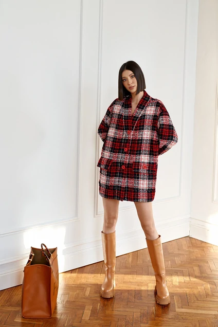 Кардиган женский выполнен из вязаного полотна с рукавом со спущенным плечом. Воротник стойка, горловина V образный вырез. Застежка - пуговицы красного цвета по центру изделия на планке. По переду два крупных кармана с нашитыми пуговицами. Длина изделия 78, длина рукава 70 см.