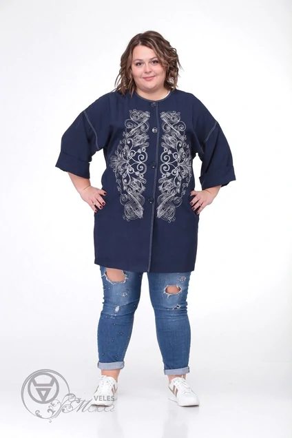 Кардиган женский свободного силуэта со спущенным рукавом и притачной манжетой. По переду украшен дизайнерской вышивкой. Застежка ценртально- бортовая на петли и пуговицы. Длина изделия- 85 см.