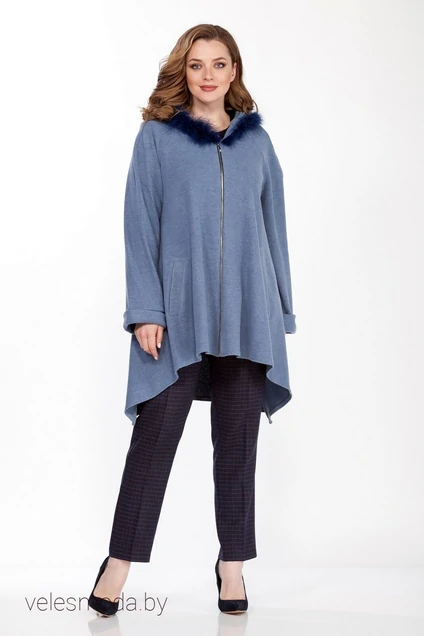 Кардиган женский А- силуэта выполнен из плотной вязаной ткани под ангору, с капюшоном, отделанным натуральным боа, на молнии, на полочках обработаны функциональные карманы с листочкой, рукав реглан с отложными манжетами. Низ кардигана асимметричный, длина по спинке- 89 см, длина рукава от горловины 74 см.
