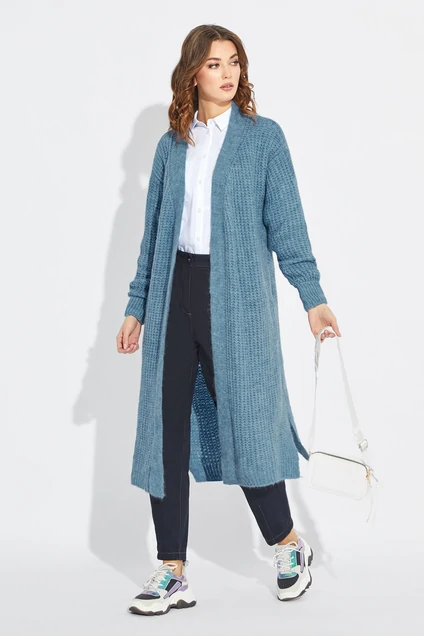 Кардиган прямого силуэта, с втачным рукавом на спущенном плече. Без застёжки с планкой. Кардиган удлиненный, разрезы по боковым швам. Длина 110 см