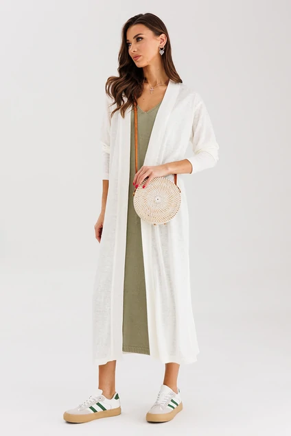 Кардиган прямого силуэта, длинный, с втачным длинным рукавом внизу на подгибке. Кардиган без застежки внизу по бокавым швам разрезы.