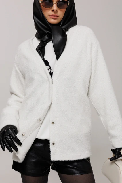 Элегантный женский кардиган белого цвета, выполнен из мягкого трикотажного полотна. Модель имеет свободный силуэт, слегка заужена к низу, что создает утонченный и современный вид. Особенностью дизайна являются спущенные линии плеч и втачные рукава, подчеркивающие расслабленный стиль. Кардиган оснащен V-образным вырезом и центральной застежкой на пришивные кнопки, добавляющие практичность и изысканность. Модель без подкладки, идеально подходит для создания лаконичных, но выразительных образов.