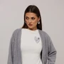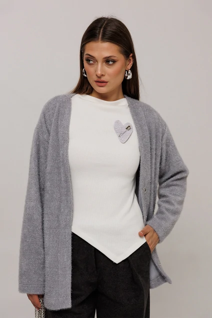Превосходный серый кардиган из мягкого трикотажного полотна представляет собой идеальный выбор для создания уютных и стильных образов. Модель отличается свободным силуэтом, слегка зауженным к низу, что добавляет изысканности. Спущенная линия плеч и втачные рукава подчеркивают расслабленный стиль изделия. Полочка оформлена V-образным вырезом и укомплектована центральной застежкой на пришивные кнопки, позволяющие легко регулировать глубину декольте. Кардиган выполнен без подкладки, что обеспечивает дополнительный комфорт при носке. Этот универсальный элемент гардероба станет прекрасным дополнением к любому ансамблю, обеспечивая тепло в прохладные дни.