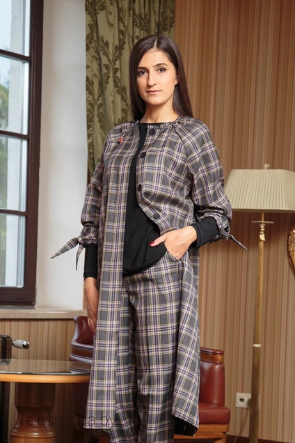 Кардиган с округлой горловиной, длинным рукавом реглан, по низу рукава- манжета. По полочке обработана функциональная застёжка на петли пуговицы, спинка цельная. Длина кардигана-112 см, длина рукава с учетом манжеты-62см, Примечание: Кардиган выполнен из сырья высокого качества произведенного в РБ , ткань устойчивой окраски ПК, малоусадочная в состав ткани входит сырье животного происхождения ( овечья шерсть ) требования к ткани строго следовать водяним знакам ГОСТ 2019 г